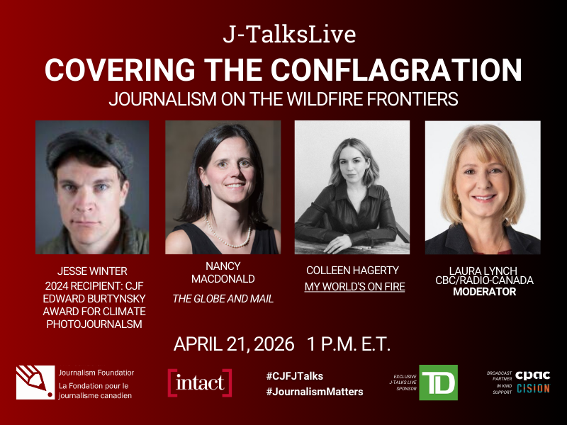 Jesse Winter, Visual Journalist and recipient of the 2024 CJF Edward Burtynsky Award for Climate Photojournalism; Nancy MacDonald, National Reporter for The Globe and Mail and Colleen Hagerty of the Solutions Journalism Network’s My World’s on Fire project will discuss what it takes to cover these events. From documenting communities forced to flee, to tracking smoke and fire across provinces and borders, to reporting on the ecological and social ripple effects of increasingly intense fire seasons, the panel will explore the practical, ethical, and emotional dimensions of wildfire journalism.